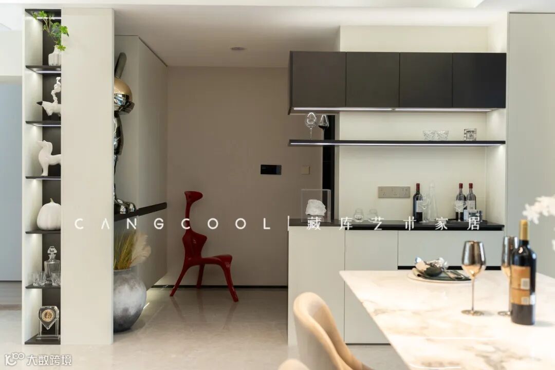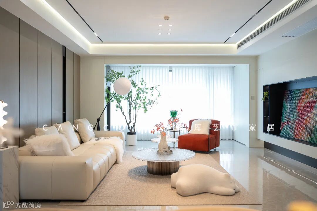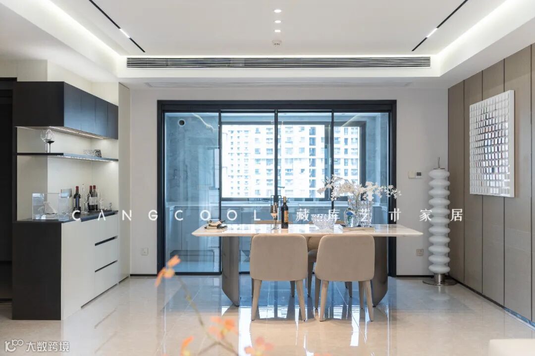 贯穿大横厅的落地窗加上竖向百叶帘的搭配,挑动着室内浪漫艺术的氛围。整体空间纯粹简约,更加开阔舒适,打破边界的去风格化设计运用在客厅尤为惊艳。