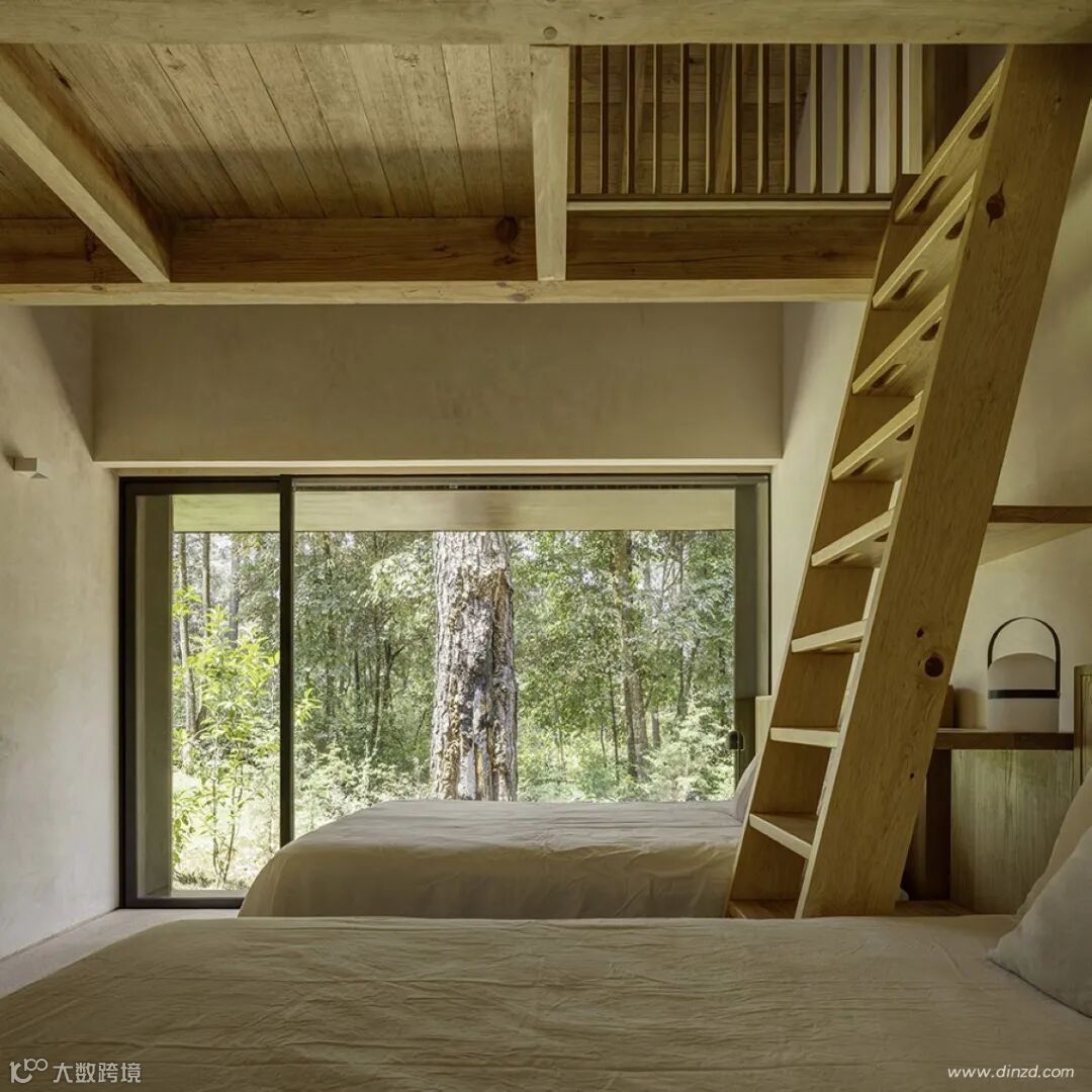 住宅面积为645平米,其设计将光线作为核心元素,旨在创造与自然环境相连的理想居住体验。房屋周围的松树使项目隐于场地,它们在设计过程中得到了密切的关注和保护。两个体量的位置也是根据树来确定,带有圆洞的露台也可以起到保护树木的作用。