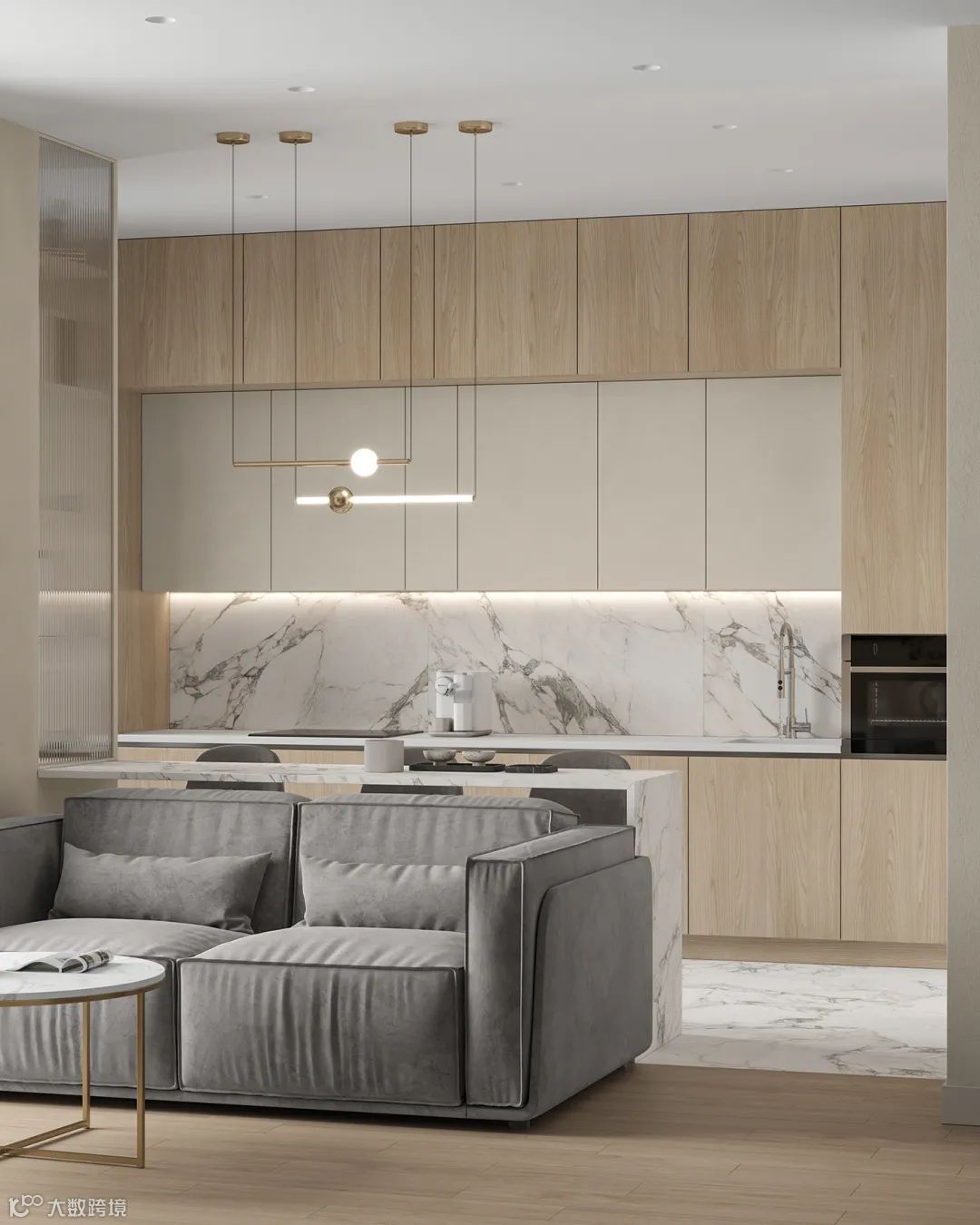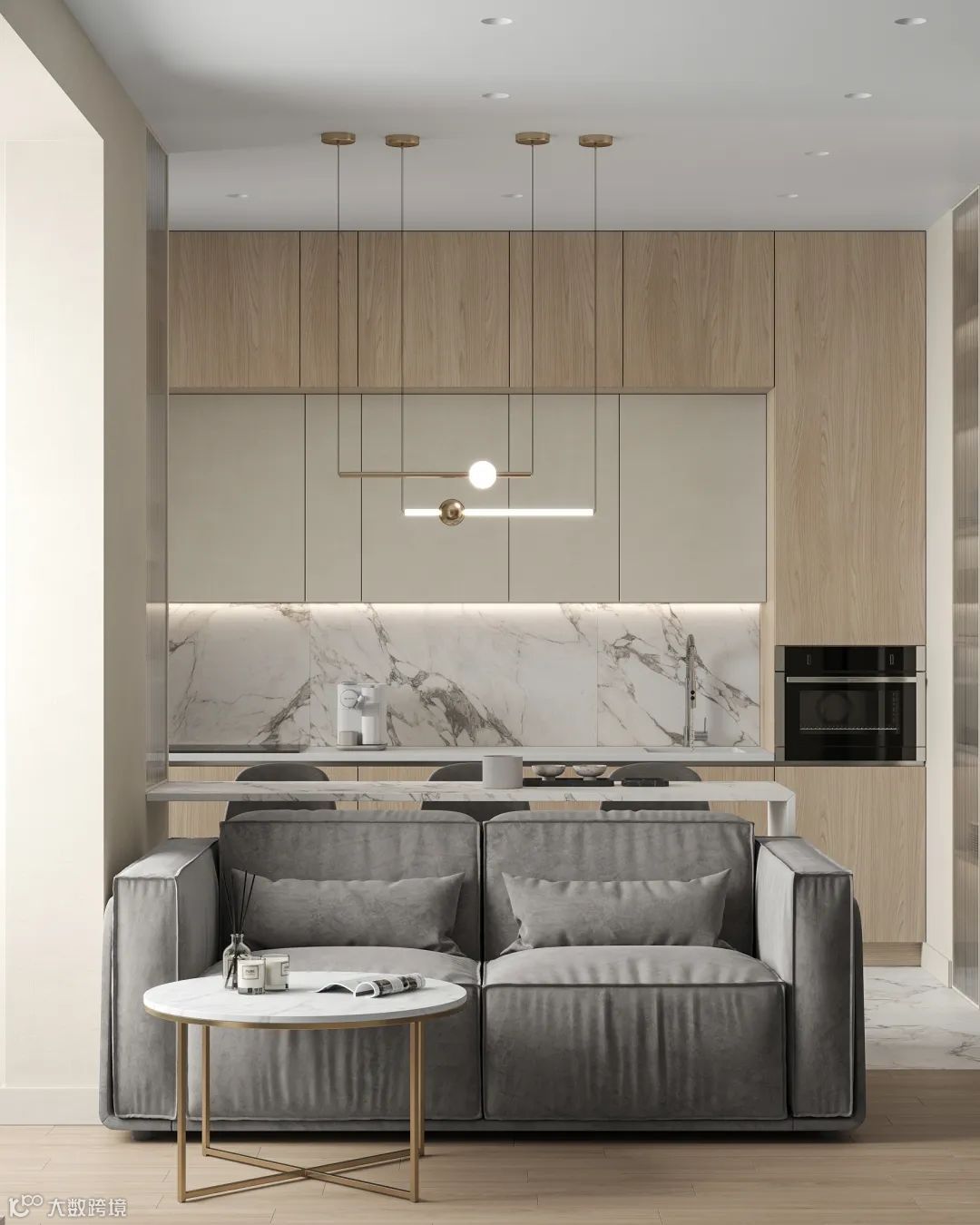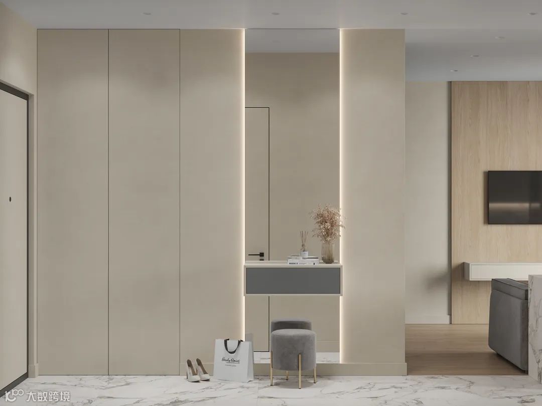 客厅的整体比较紧凑,以奶咖色和浅灰色为基调,和带有金属元素的玻璃门,凝聚出轻奢小资感。