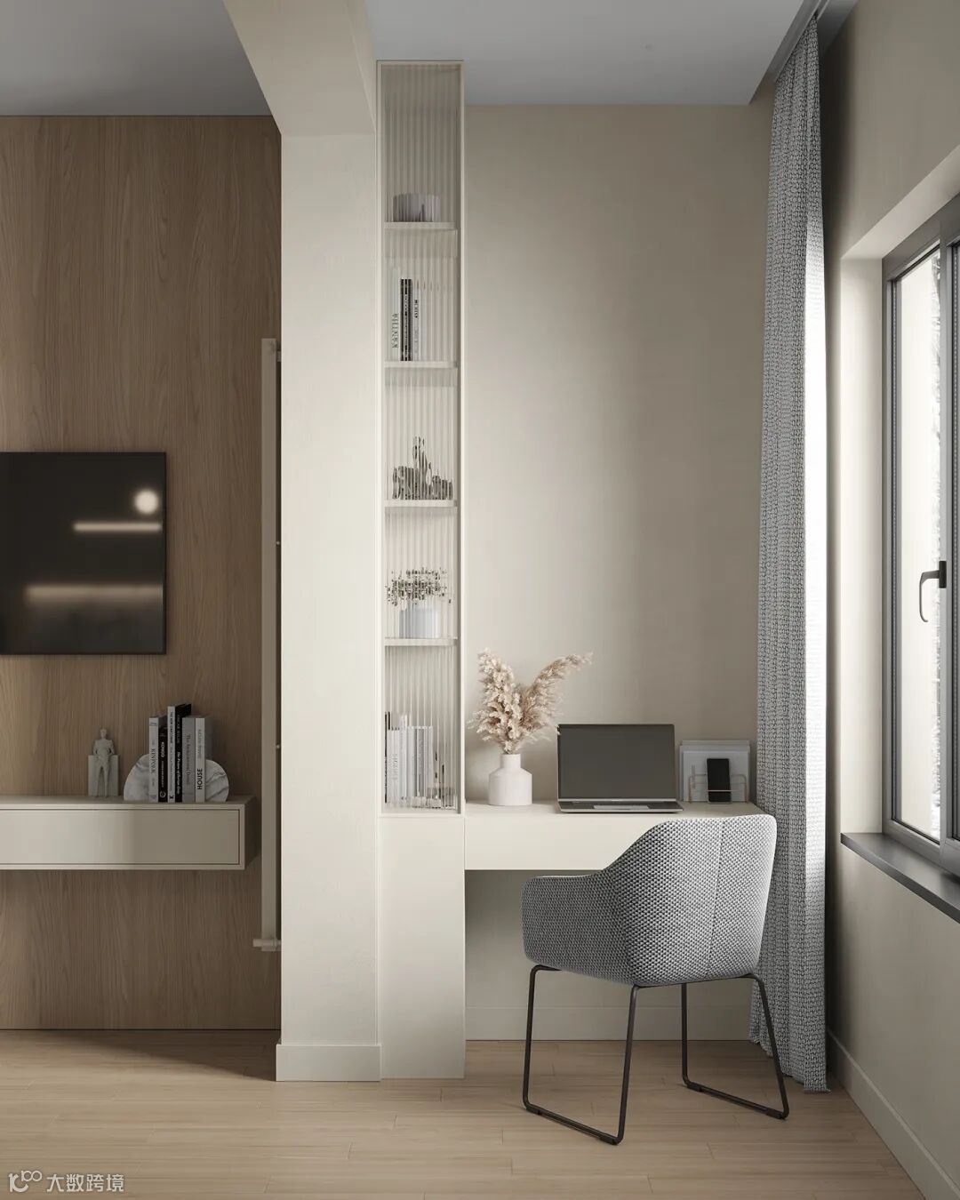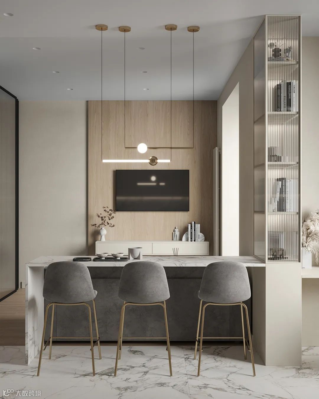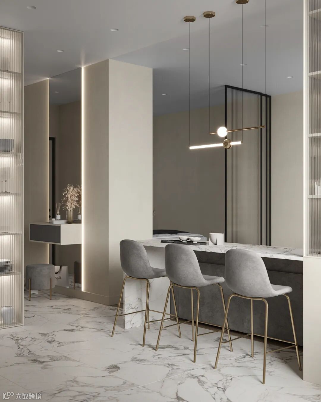 客厅的整体比较紧凑,以奶咖色和浅灰色为基调,和带有金属元素的玻璃门,凝聚出轻奢小资感。