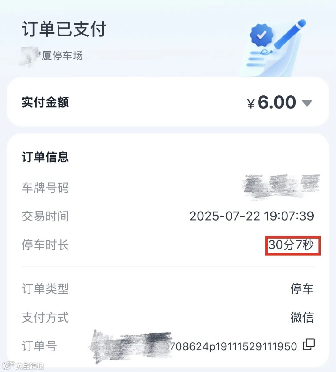 图为某大厦停车场停车费支付订单截图。(受访者供图)