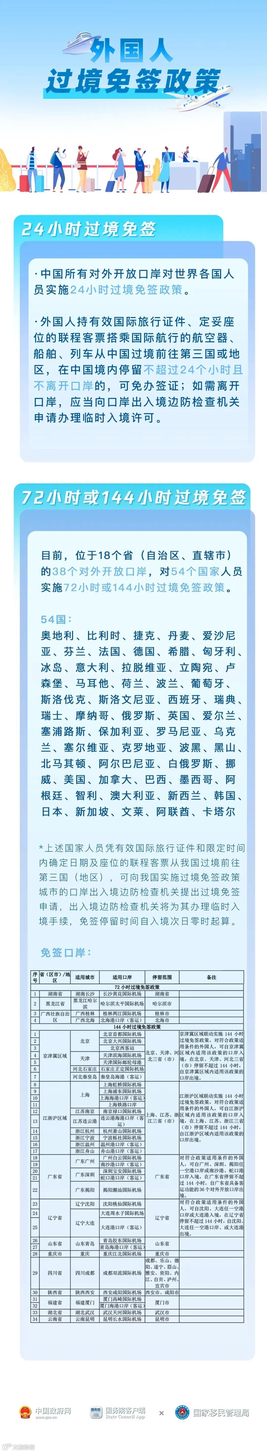 中国政府网、国务院客户端联合国家移民管理局制作“一图读懂”外国人过境免签政策(