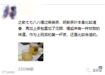 先是香气入口鼻,享受花香给你带来的甜美和愉悦;然后是明前恩施玉露带来的茶香,带点饱满的单宁,回甘爽口。
