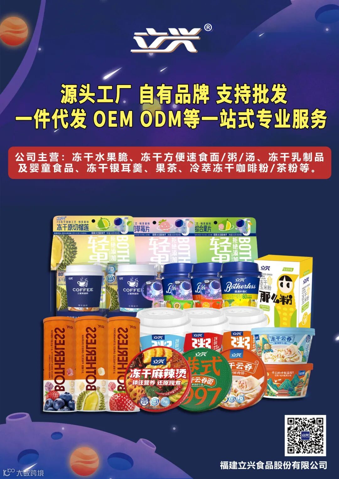 察势者智,顺势者赢。福建立兴以市场为导向,以消费者为中心,不断探索和创新,积极推进产品升级和品牌建设。目前公司主营产品包括:冻干水果、蔬菜、速食方便食品、咖啡、茶、高端饮品、乳制品、婴童食品及植物萃取粉和浓缩液等众多系列产品,被行业誉为“全品类冻干大师”,产品畅销全国各地并出口欧盟、美国、日本、加拿大、俄罗斯、韩国、东南亚等国家。