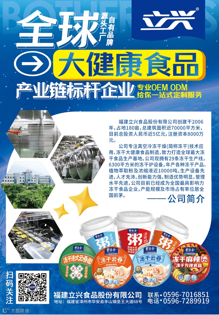 福建立兴食品股份有限公司创建于2006年,公司专注真空冷冻干燥(简称冻干)技术应用、冻干大健康食品制造,致力打造全球最大冻干食品生产基地。