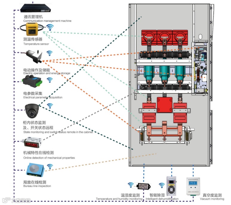 采用单独的无线测温设备,温度传感器可设置于在断路器及接触器“触臂”上。实时采集并监测高压开关设备关键点的温升及断路器特性数据,依据回路实际负荷,与实际监视到的开关柜温升进行智能分析,识别出开关设备的潜在故障。所有10kV间隔均应配置无线测温装置。配置原则馈线开关柜内设6个测点。检测开关柜内易发热的触头、母线接头设温度检测点。进线开关柜内设9个测点,另检查进线封闭母线或进线电缆端子温度。所测温度能够独立测温且在现场安装的操作面板上可显示实际测量温度,并上传在集中监控主机上,显示所有被测点的实时温度,以便在故障发生之前及时、准确的监测它们的温度变化并发出预警,有效的避免发生事故或引起火灾。
