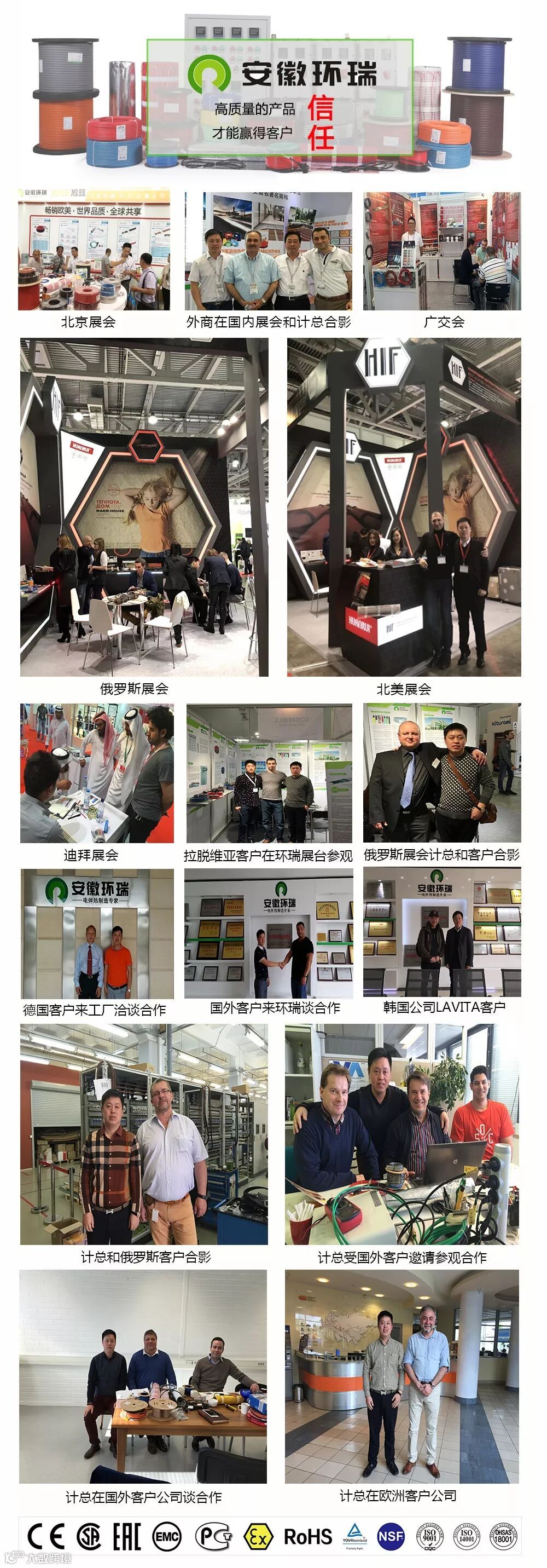 安徽环瑞系列产品通过了国家防爆电气产品质量监督检验中心、国家电线电缆质量监督检验中心检验的同时,取得了欧盟CE认证、RoHS认证、独联体EAC、德国TUV认证、欧洲ATEX和北美CSA等国内、国际认证。并成功出口到英国、加拿大、俄罗斯、匈牙利、拉脱维亚、印度、沙特阿拉伯、亚美尼亚、巴西等全球20多个国家和地区,深得用户信赖。