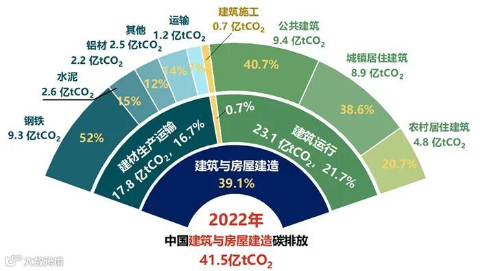 实现“双碳”目标,建筑行业是重中之重。根据中国建筑节能协会发布的数据,2022年房屋建筑全过程碳排放总量达41.5亿tCO₂,约占全国能源相关碳排放的39.1%。其中,建筑运行阶段碳排放高达23.1亿tCO₂,占比达21.7%。