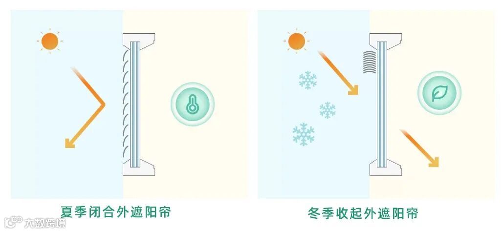 在夏季太阳直接照射时段放下遮阳帘,可把热量挡在室外,从而降低空调能耗;在冬季可将遮阳帘收起,让室内尽可能地得到太阳热量,降低采暖能耗,提高居住环境舒适度。