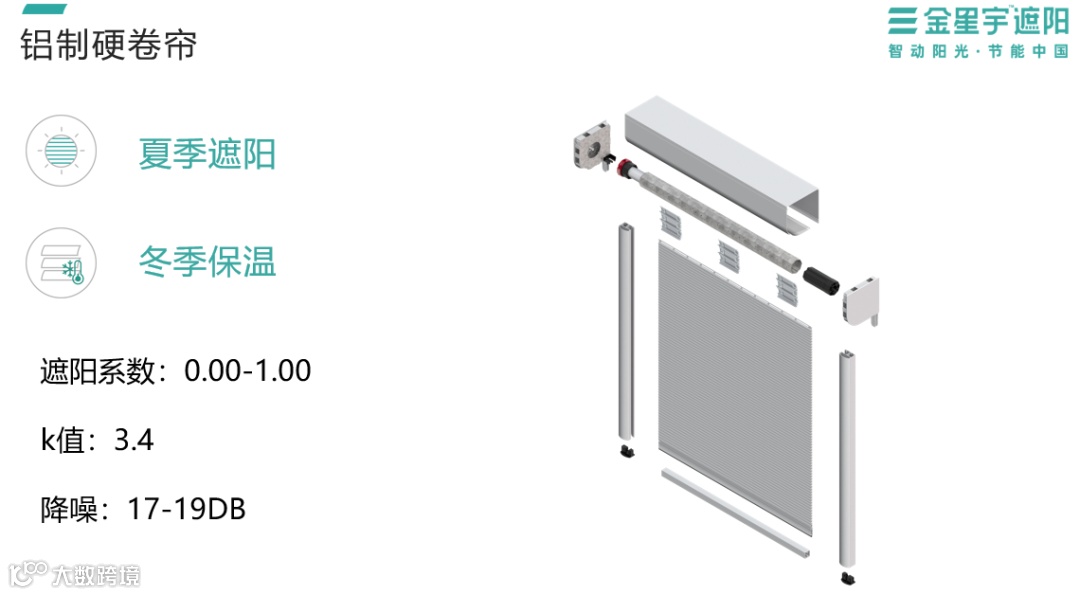 1.1:铝制硬卷帘。广泛应用于居住建筑。在完全关闭卷帘时,拥有100%的遮光率。当然,她也可以在任何位置悬停,来满足遮阳和采光的需求。带有聚氨酯发泡的帘片,可阻碍音波传递,兼有夏季隔热、冬季保温的效果,带来安静舒适环境的同时降低空调地暖的使用能耗。其性能指标参数:1.遮阳系数0.00-1.00;2.传热系数k=3.4;3.能降噪17-19分贝;如下图: