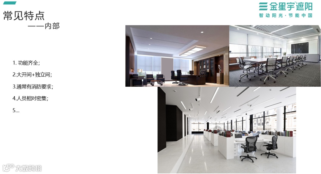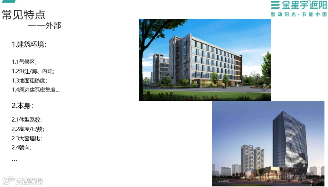 建筑的常见特点,可以简单分为:外部特点和内部特点,如下图。通常建筑的外部特点是选择外遮阳产品的性能和款式的重要依据,而内部又是选择外遮阳功能的重点参考因素。