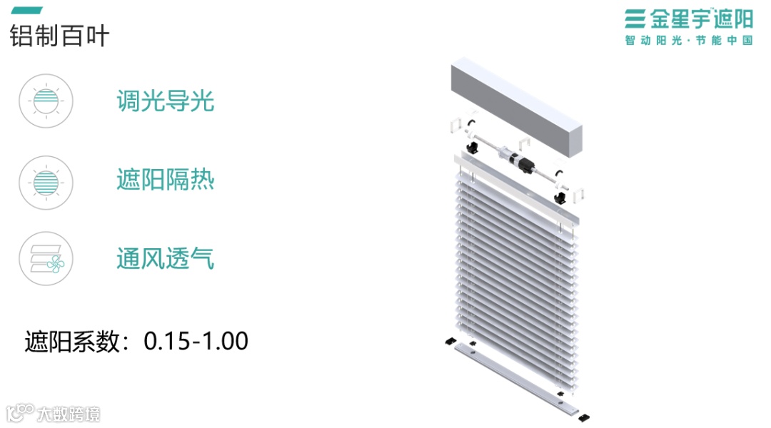 1.2:铝制百叶。广泛使用于公共和居住建筑。铝制百叶在满足了刚性遮阳的同时,其独特的导光功能也能确保室内有充足、柔和阳光,减少空调及照明能耗的同时也减少眩光;铝制百叶在隔热及降噪性能上不如铝制硬卷帘,但有铝制硬卷帘无可比拟的导光功能优势;她的遮阳系数0.15-1.0;如下图:
