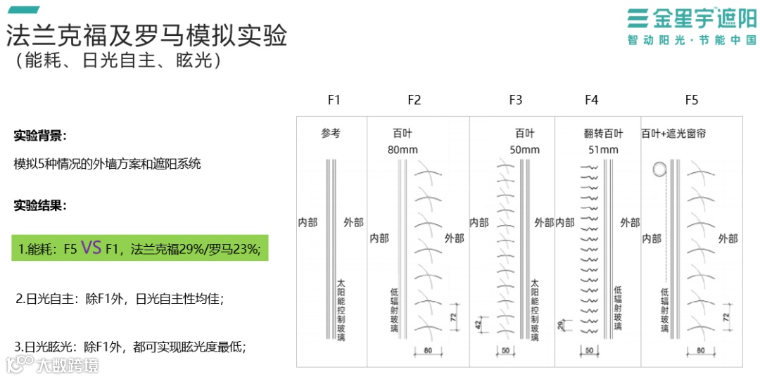 有了痛点,就促使我们来研究如何解决它。早在2011年,欧洲最大的太阳能研究机构---德国弗劳恩霍夫太阳能系统研究院的高级研究员姜·维诺德就联合瑞士南方应用技术大学的弗朗西斯科·弗朗蒂尼教授,两人共同就法兰克福及罗马气候条件下模拟了5种情况的遮阳系统方案(如下图),以重点验证能耗、兼顾日光自主及眩光三个遮阳指标。最终得出结论:方案五室内反射率为84%的遮光窗帘+低辐射玻璃+90°叶片+100%组合,在法兰克福/罗马分别比仅采用太阳能控制玻璃方案,在因室内完全闭光而采用的照明能耗抵充后仍有29%/23%节能率。