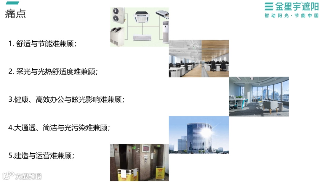 痛点其实也是咱们在设计和建造的过程中,需要重点克服和避免的。主要表现为:舒适与节能难兼顾、采光与光热舒适度难兼顾、健康、高效办公与眩光影响难兼顾、大通透与光污染难兼顾、建造与运营难兼顾等,如下图。