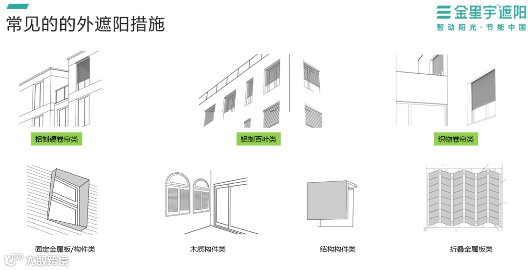 建筑外遮阳措施大约7种,这7中措施各有利弊。但真正使用最多的还是铝制硬卷帘、铝制百叶、织物卷帘,这三种产品约占建筑立面外遮阳的99%以上。如下图: