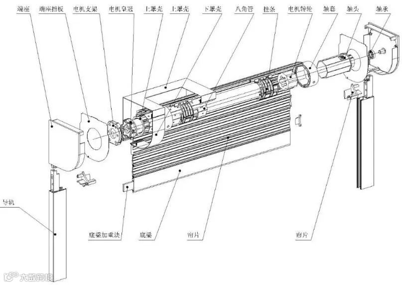 如图 2 所示,外遮阳卷闸窗(金属硬卷帘)由罩壳、端座、电动驱动系统、连接器、卷管、导轨、铝合金发泡帘片、底梁等部分组成。产品标准:《建筑遮阳硬卷帘》JG/T443-2014。