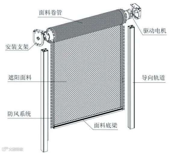 如图 3 所示,抗风型软卷帘由安装支架、电动驱动系统、面料卷管、导向导轨、遮阳面料、防风系统、底梁等部分组成。其产品标准为《建筑用遮阳软卷帘》JG/T254-2015。