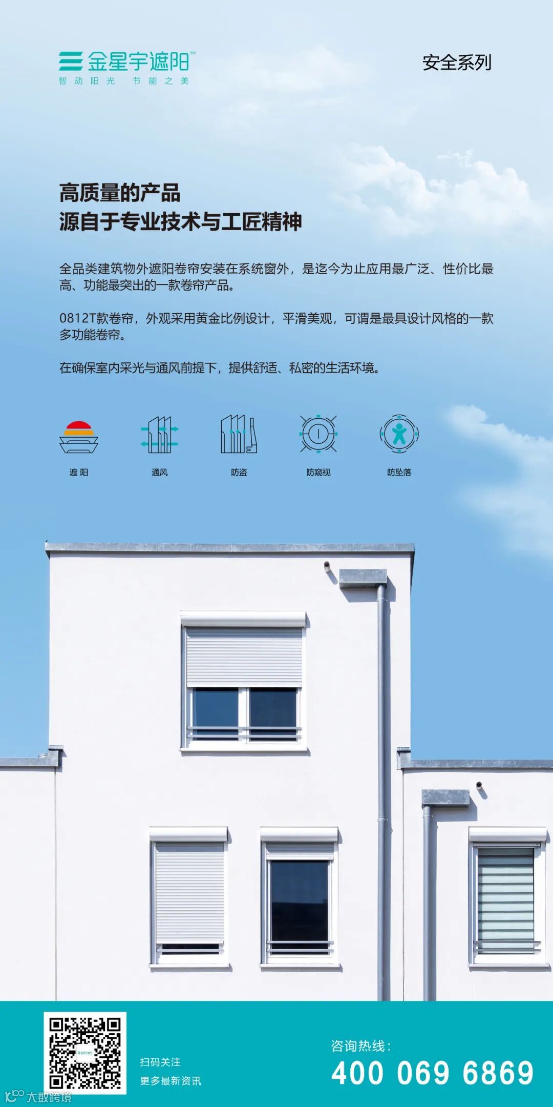 注意分析应用地区地理位置、气候特征、建筑高度等建筑特点,确定各种因素对外遮阳装置使用的主要影响,对超宽规格窗户外遮阳产品设计分幅处理,确保安全可靠。采用电动形式外遮阳产品,设置风速感应系统,可对外遮阳产品使用增加更多的安全保障。