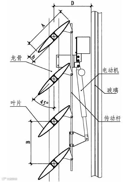 如图 4 所示,机翼遮阳板由龙骨型材、机翼遮阳板(叶片)、叶片转动轴、推杆电机、传动连杆等部分组成。其产品标准为《建筑用铝合金遮阳板》JG/T416-2013。