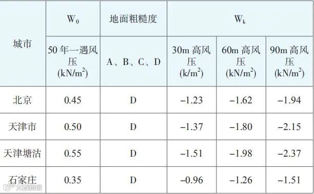 表 3 北京、天津、石家庄三地(D 类)风荷载标准值