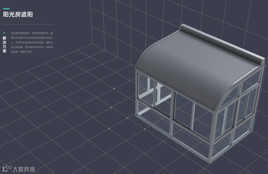解决方法:遮阳系统,为尽可能减少夏季进入阳光房的热量,可在阳光房的顶部安装遮阳系统。