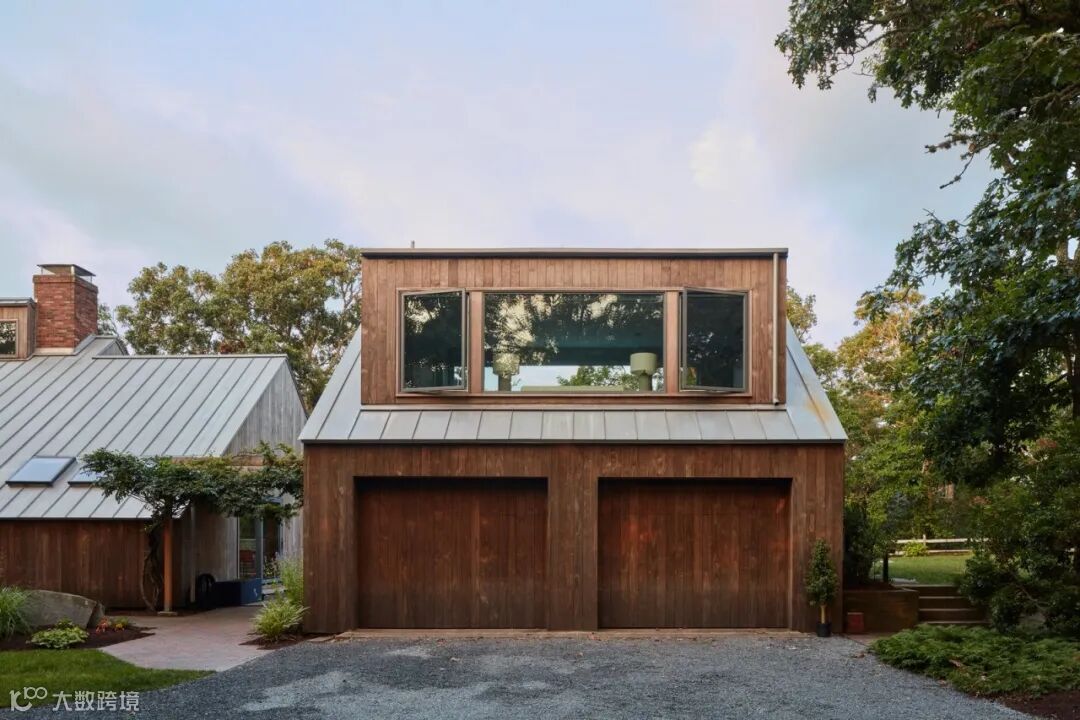 在科德角的1970年代房屋群中,在拆除了老旧的外墙后,整个房子取而代之的是垂直的侧板条和铜立缝金属屋顶,并将车库门分成了两个。