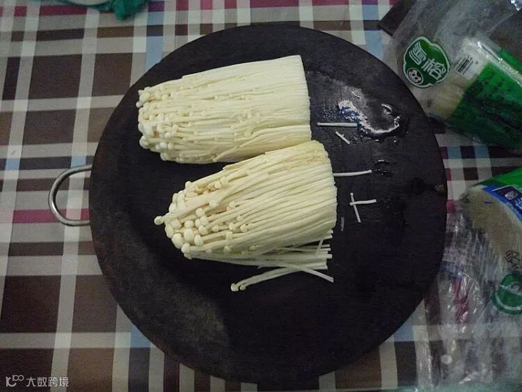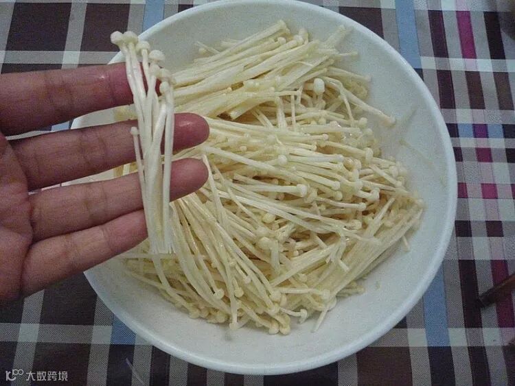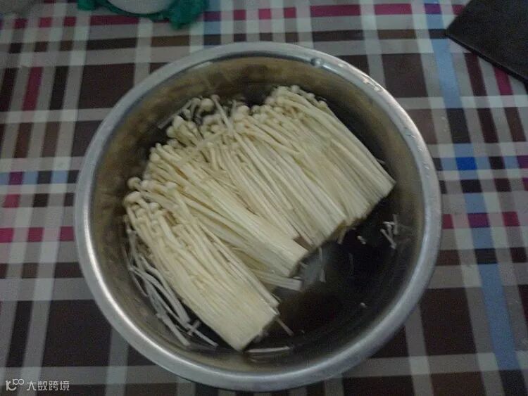 切去老根的金针菇冲洗干净,放入清水中浸泡一会。