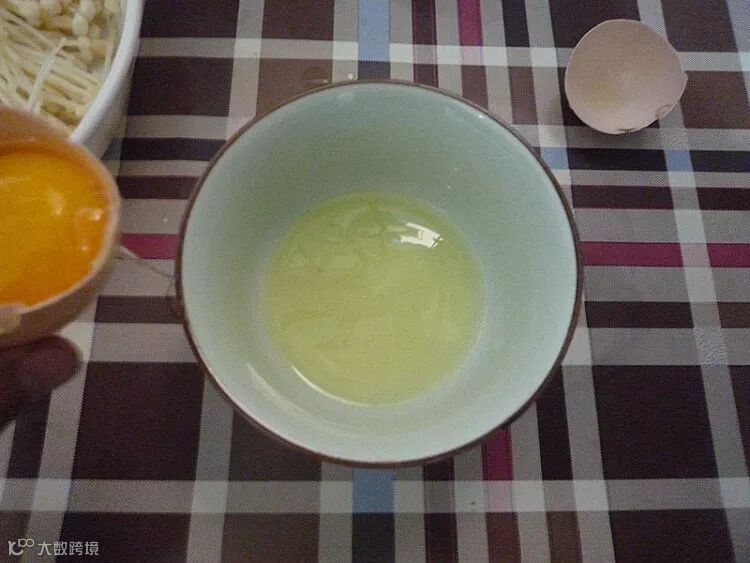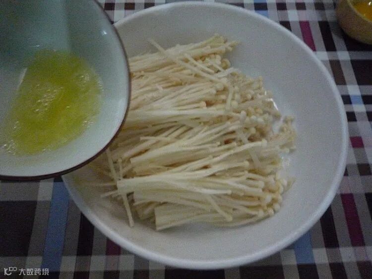 蛋白打撒,倒入金针菇中拌匀。