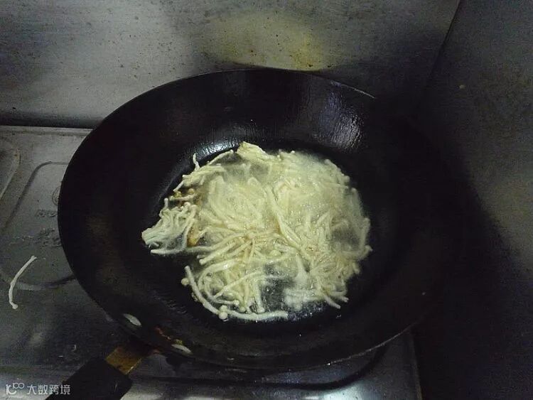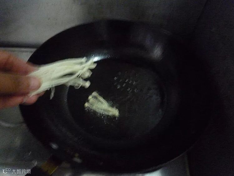 锅中烧热油,放入六七成热,放入金针菇炸制。