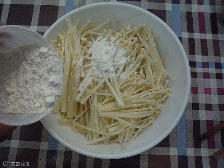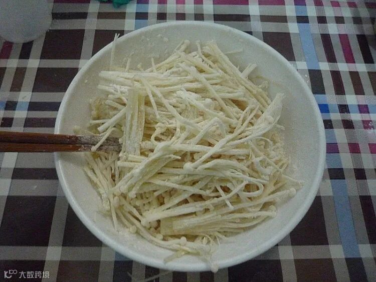 加入面粉后拌匀,尽量使每个金针菇都沾上面粉。