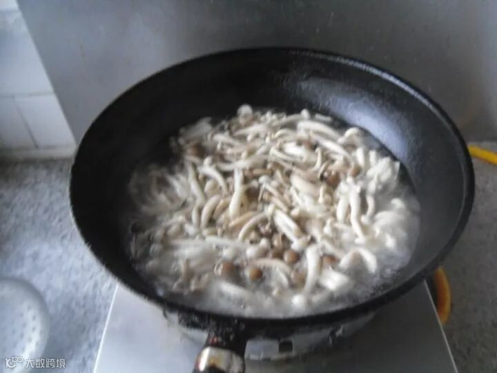锅烧开水,放入白玉菇、蟹味菇汆烫1分钟
