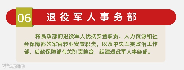 将民政部的退役军人优抚安置职责,人力资源和社会保障部的军官转业安置职责,以及中央军委政治工作部、后勤保障部有关职责整合,组建退役军人事务部,作为国务院组成部门。