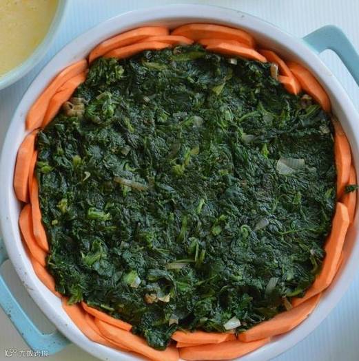 步骤二:将菠菜洗净,切碎后与葱、蒜放在一起炒,然后撒在红薯片上。