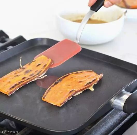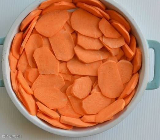 步骤一:将红薯冲洗干净,切成片后均匀铺在披萨盘底部。
