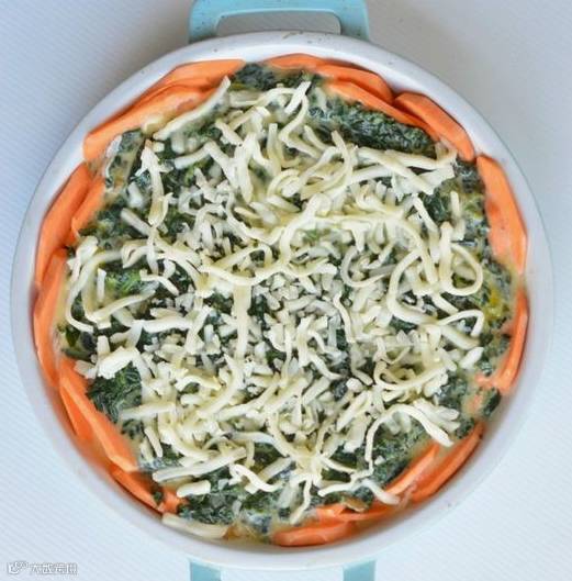 步骤四:最后铺上一层芝士碎,一切就绪,就可放入烤箱了。
