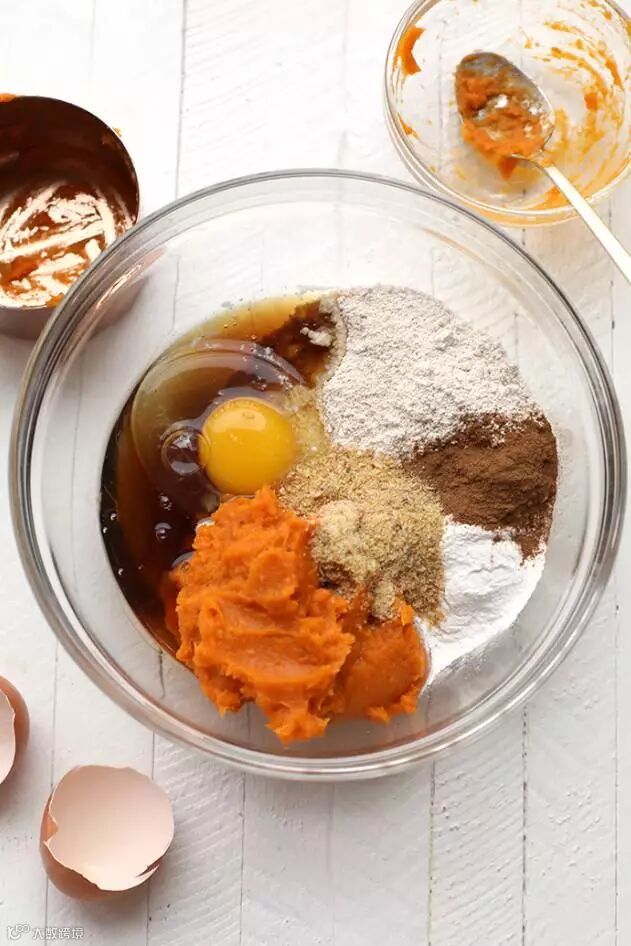 步骤二: 红薯泥配上蜂蜜、鸡蛋、面粉、油、盐、糖以及适量可可粉搅拌均匀。
