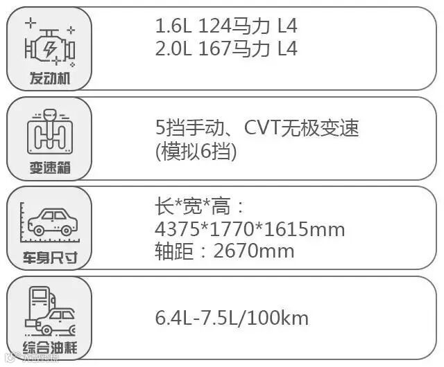 动力方面,新车依旧搭载了1.6L和2.0L自然吸气发动机,其最大输出功率分别为124马力与167马力。传动系统与发动机匹配的是5速手动或CVT变速箱。