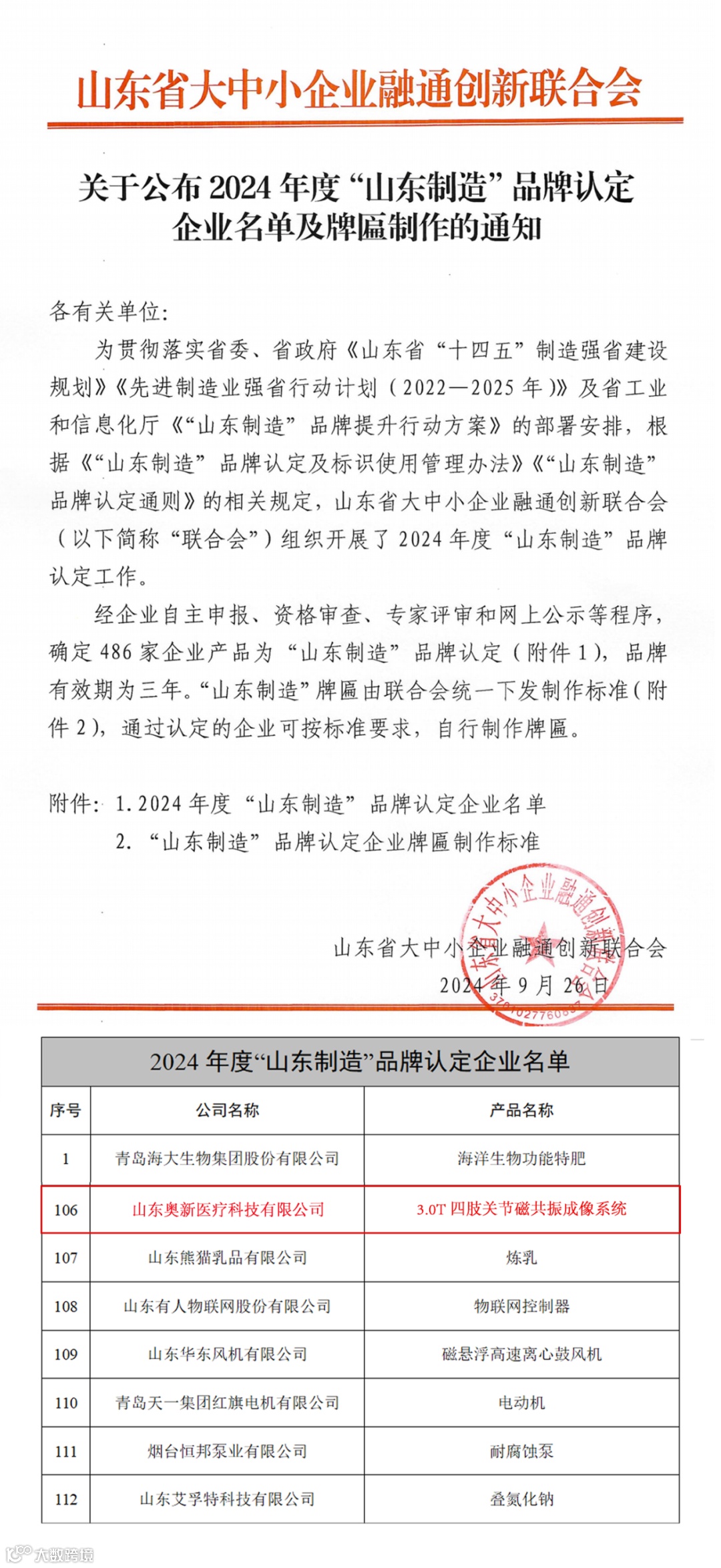 近日,山东省大中小企业融通创新联合会公布了2024年“山东制造”品牌认定名单,我司3.0T 四肢关节磁共振成像系统成功入选。