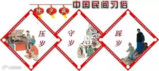 中国民间在除夕有守岁的习惯。守岁是从吃年夜饭开始,一夜不睡,以迎候新年的到来。这顿年夜饭要慢慢地吃,从掌灯时分入席,有的人家一直要吃到深夜。守岁的习俗,既有对如水逝去的岁月含惜别留恋之情,又有对来临的新年寄以美好希望之意。