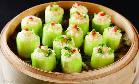4、再将扇贝蓉酿入丝瓜块里,同时,在每个扇贝蓉上,加入少量的马哈鱼籽;