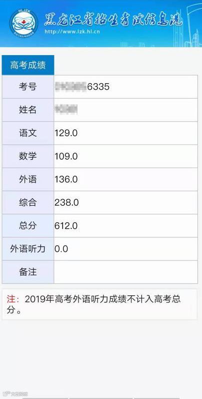 恭喜来自黑龙江的一位考生以612的高分成绩夺冠