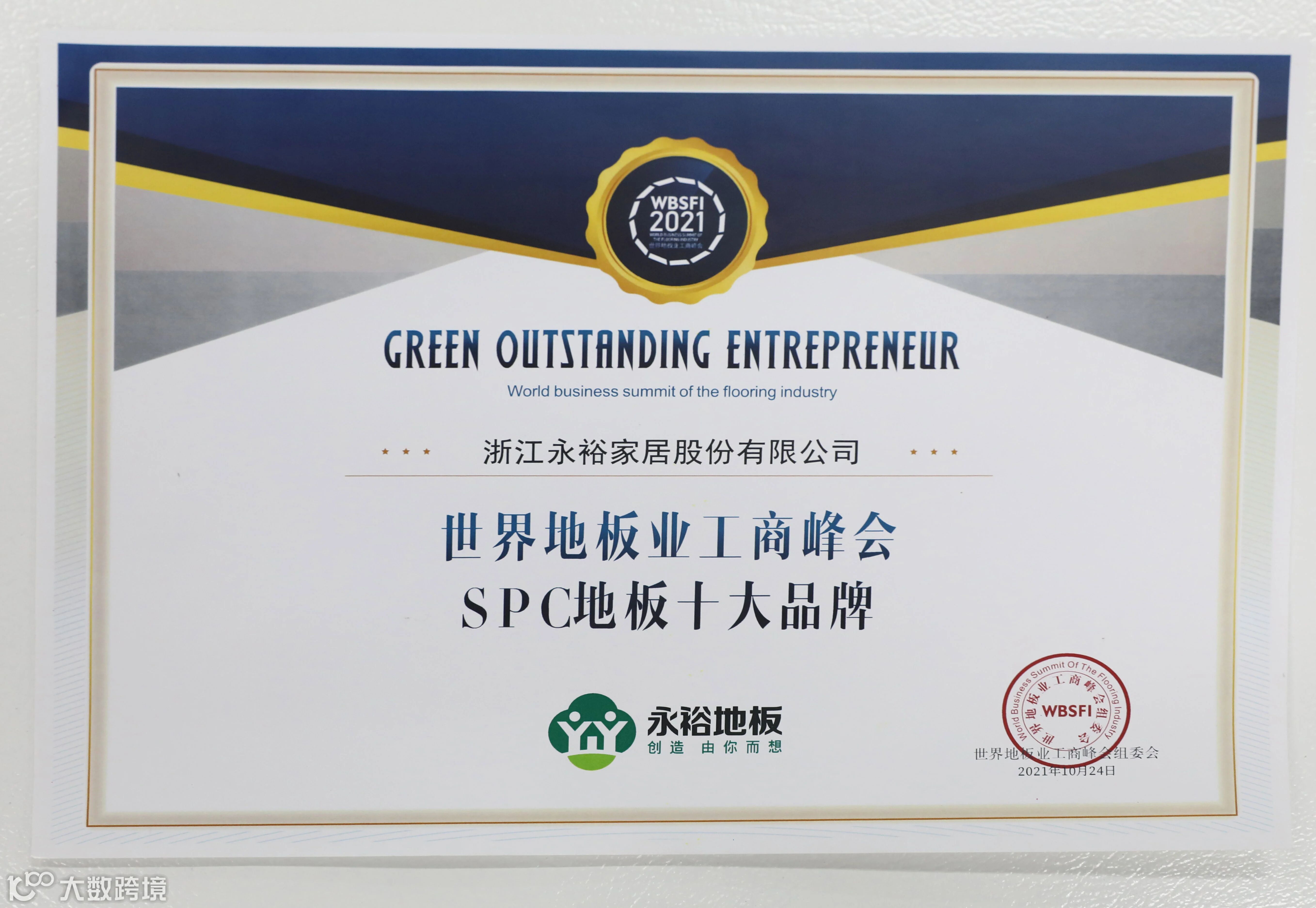 2021年10月24日世界地板业工商峰会,荣获SPC地板十大品牌以及产品金奖。