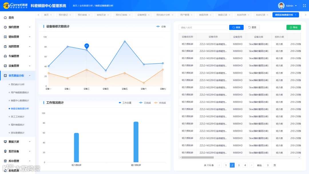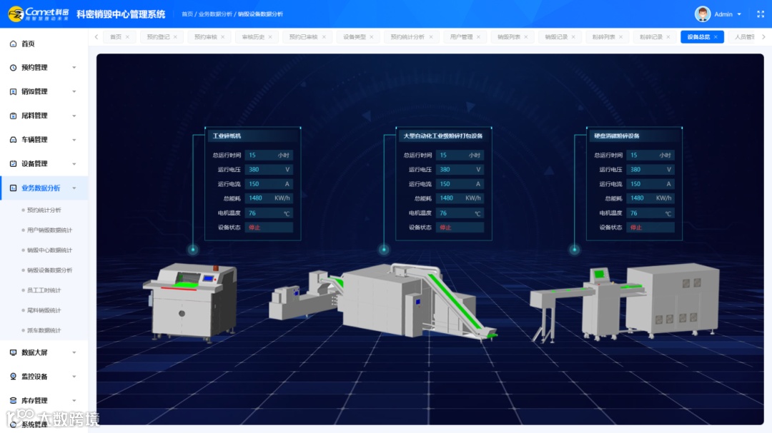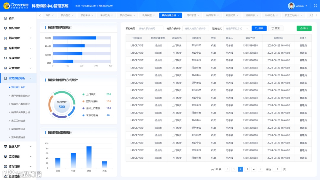该系统主要包含预约管理、销毁管理、尾料管理、车辆管理、设备管理、业务数据分析、库存管理等板块,可实现销毁载体作业的日志管理,对工作状态进行实时监测等,确保销毁过程的安全可控。