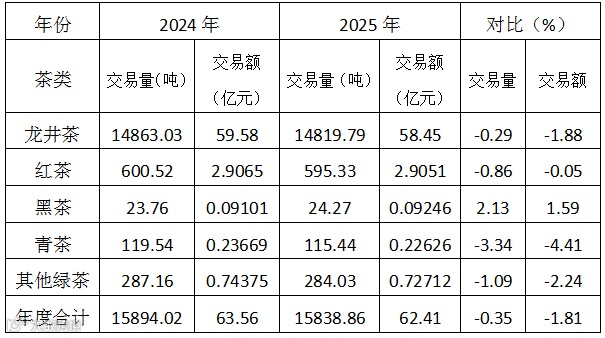 截止2025年12月31日,中国茶市交易总量15838.86吨,比2024年15894.02吨,减少55.16吨,降幅0.35%;交易总额62.41亿元,比2024年63.56亿元,减少1.15亿元,降幅1.81%。从市场统计数据分析,2025年各茶类交易趋势呈现出:多数茶类量价有不同幅度下降,市场交易略显疲乏,行业整体复苏迹象缓慢。(见下表)