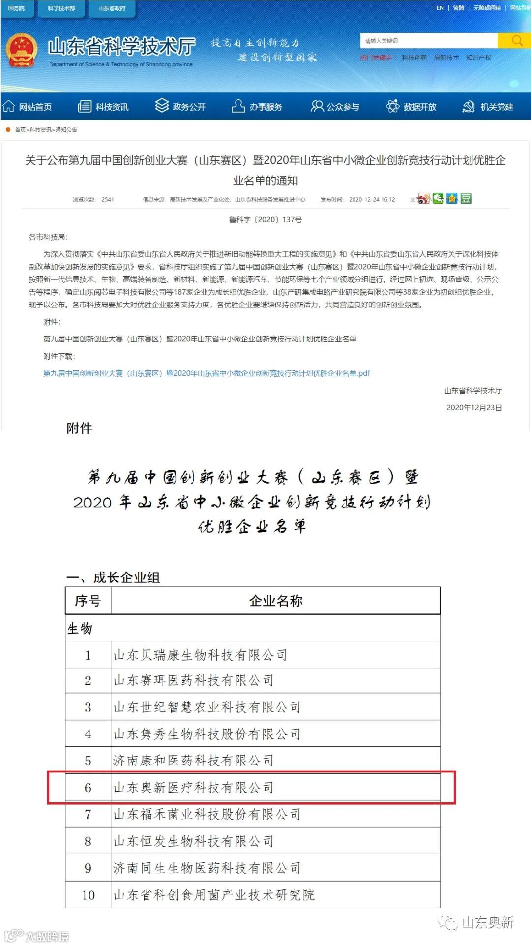 继2020年10月23日山东奥新医疗科技有限公司荣获“第九届中国创新创业大赛(全国赛)优秀企业”称号后,2020年12月23日,经山东省科学技术厅公布,山东奥新医疗科技有限公司“3.0T 肢端磁共振整机系统”项目再获“第九届中国创新创业大赛(山东赛区)暨2020年山东省中小微企业创新竞技行动计划(成长企业组——生物领域)优胜企业”荣誉称号。