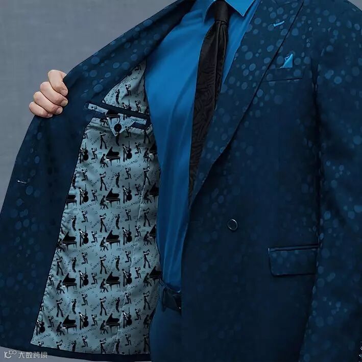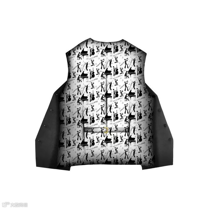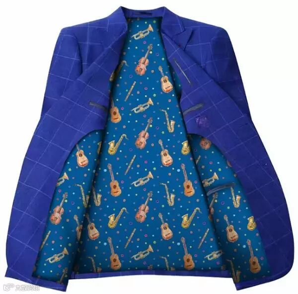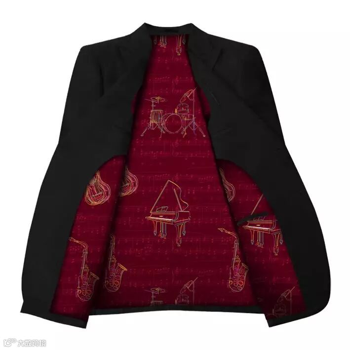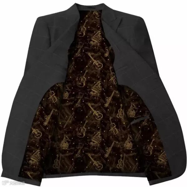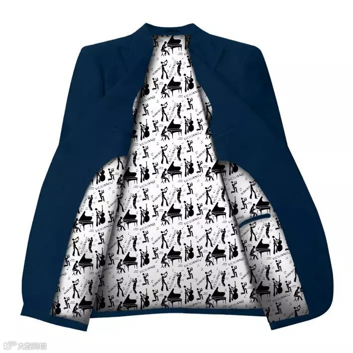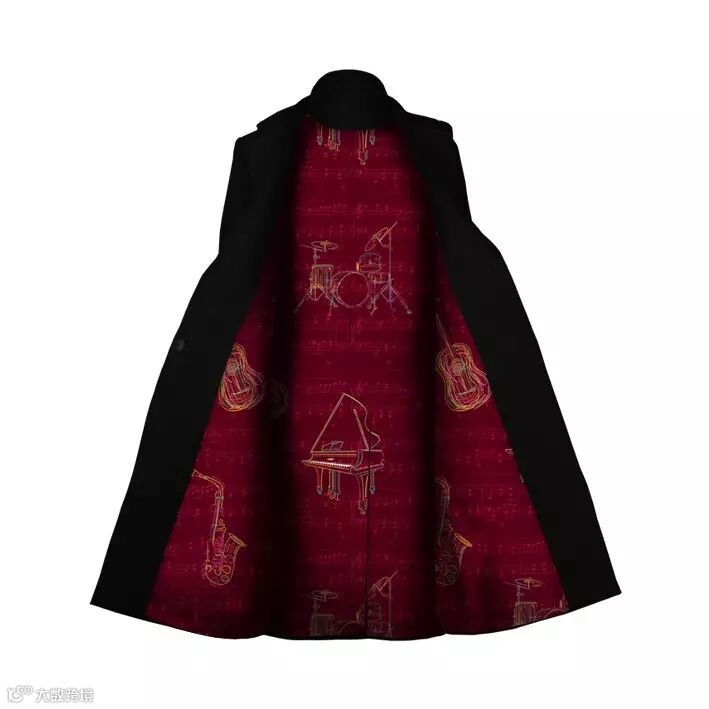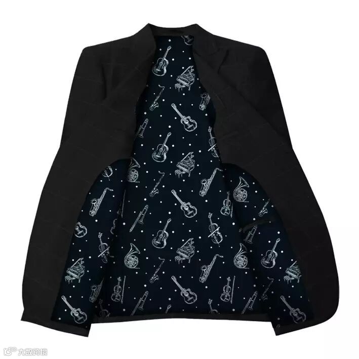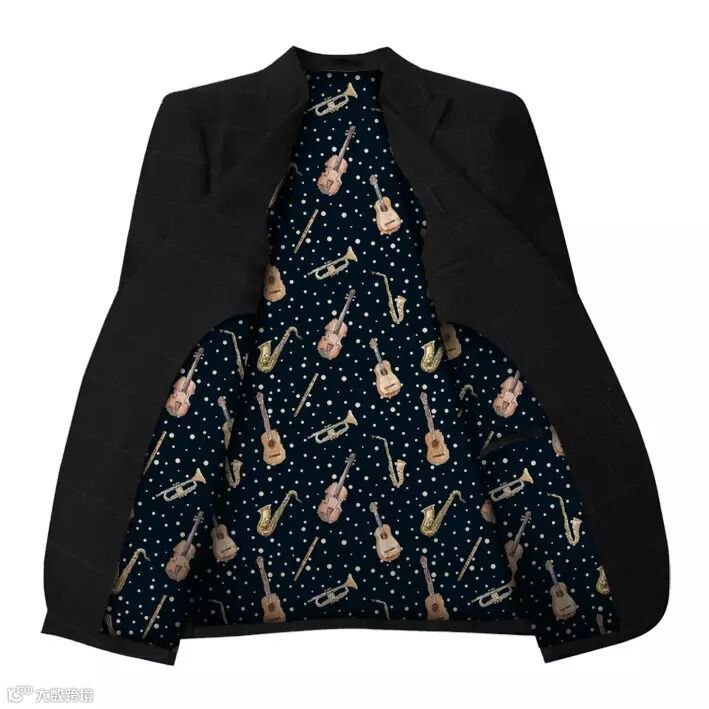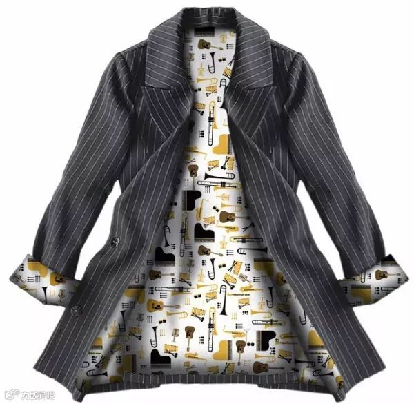 本期以音乐为主题,用吉他、长号、钢琴和小提琴等乐器为主要元素来进行花型设计。通过乐器的不同形式与印花设计相结合让里料仿佛也有了声音与律动感。