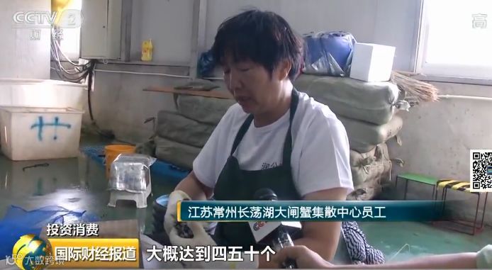 江苏常州长荡湖大闸蟹集散中心员工:每天我们这里绑螃蟹的人大概达到四五十个,一个人最快的手要绑到四五千只,一般普通的都绑到两三千只,大概七八秒一只,一分钟大概达到七八只。
