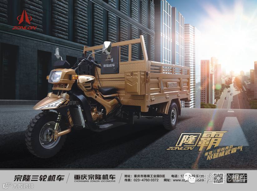 重载三轮的典范,尽显威武霸气,采用市场定制版黄金双冷王265发动机(最高时速≥80Km/h,最大坡度≥23°),汽车动平衡技术(60 Km/h脱把行驶一条直线),自主研发“宗隆造”前减震(过减速带如履平地),轻松上楼,超强舒适;独具个性的子弹头壳(仿生鸟喙造型设计,有效导流减低风阻),“驰聘天下,唯我隆霸”。