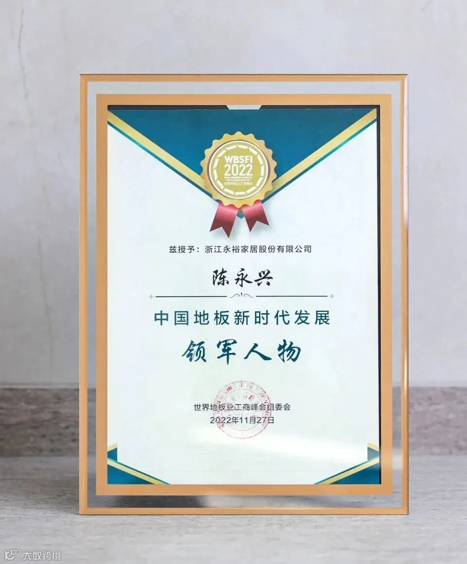 为表彰地板企业家为地板行业做出的贡献,大会现场进行了“中国地板新时代发展领军人物”颁奖仪式,峰会上向优秀企业家——永裕家居董事长陈永兴授予“中国地板新时代发展领军人物”称号。