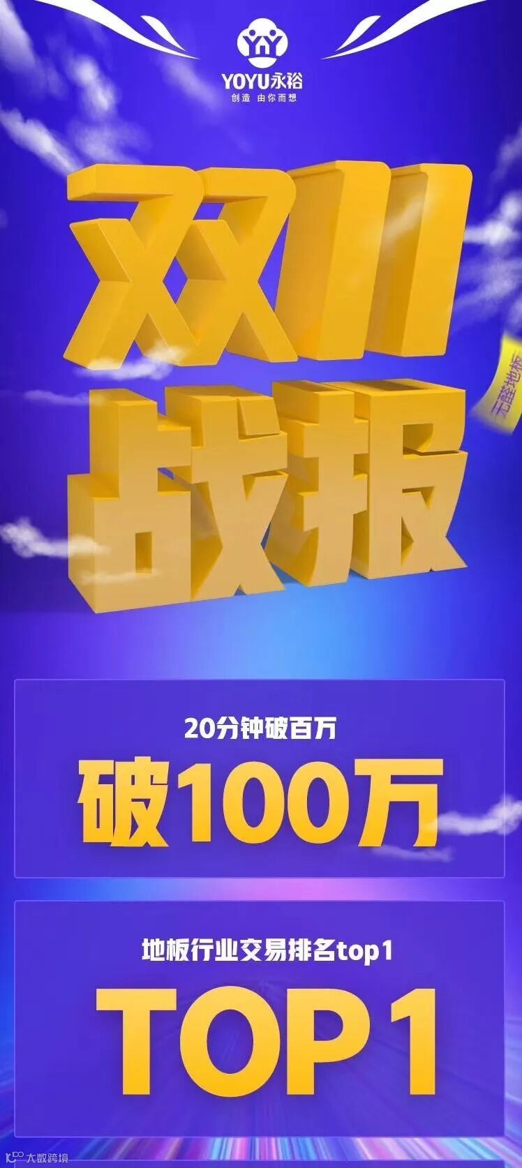 今年双11永裕销量在零点开抢后20分,突破100万元,冲击地板类目榜首,120分钟250万。